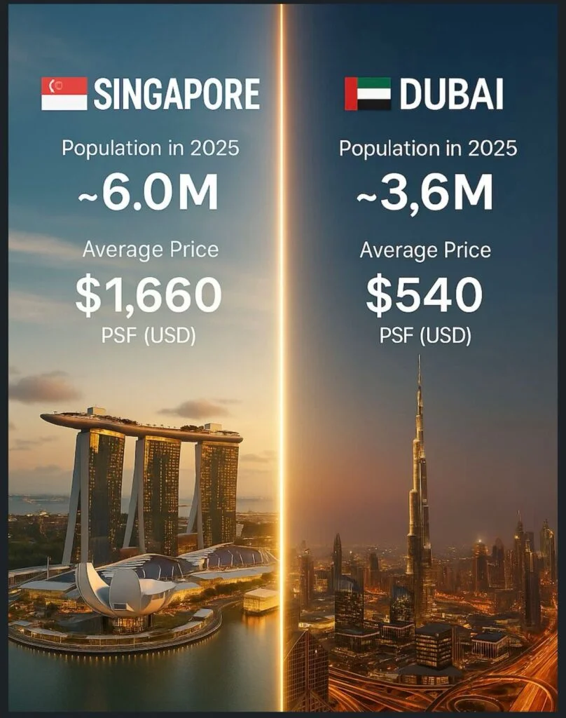 - Dubai: ~3.6 million people; Avg property price: $540 psf—roughly one-third of Singapore’s pricing.