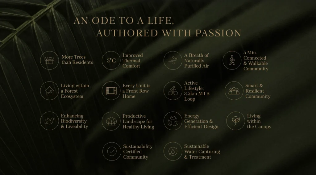 Every home is crafted to maximize natural light, airflow, and forest views, with floor-to-ceiling glazing and sustainable materials like red travertine and green marble.