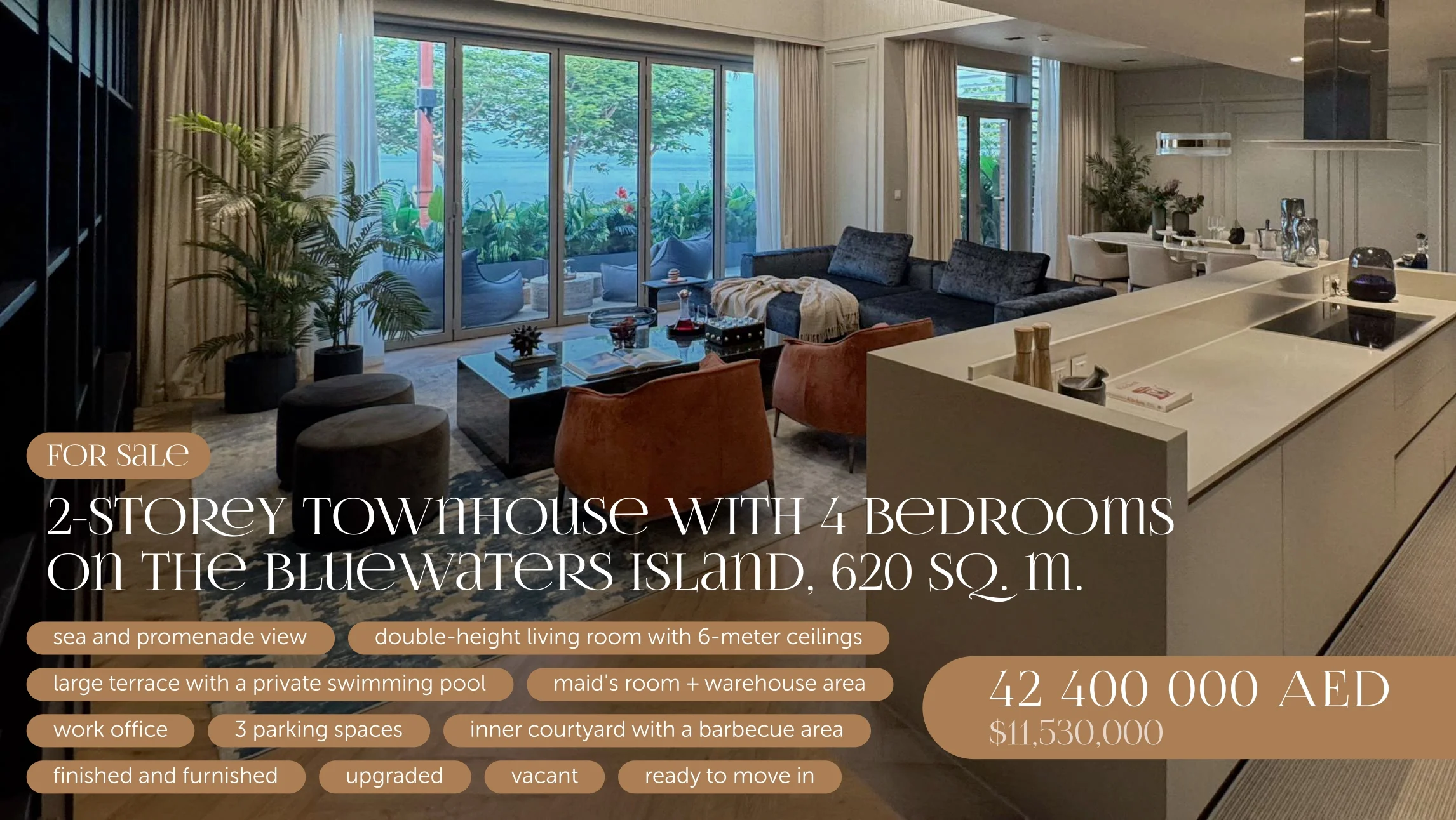 Discover the ultimate waterfront lifestyle with this luxury 4-bedroom townhouse for sale on Bluewaters Island, Dubai. Spanning 620 sq. m., this fully furnished and upgraded residence boasts a double-height living room with 6-meter ceilings, a large terrace with a private swimming pool, and breathtaking sea and promenade views.