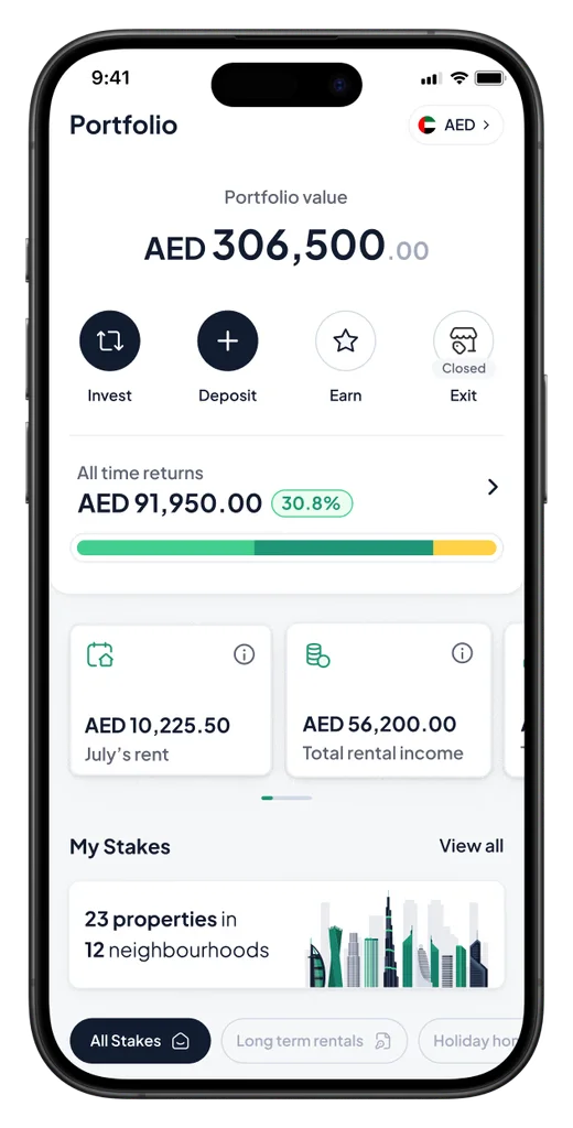 Stake combines property ownership with modern fintech simplicity. Unlike traditional methods of investing in Dubai real estate, you can now:
